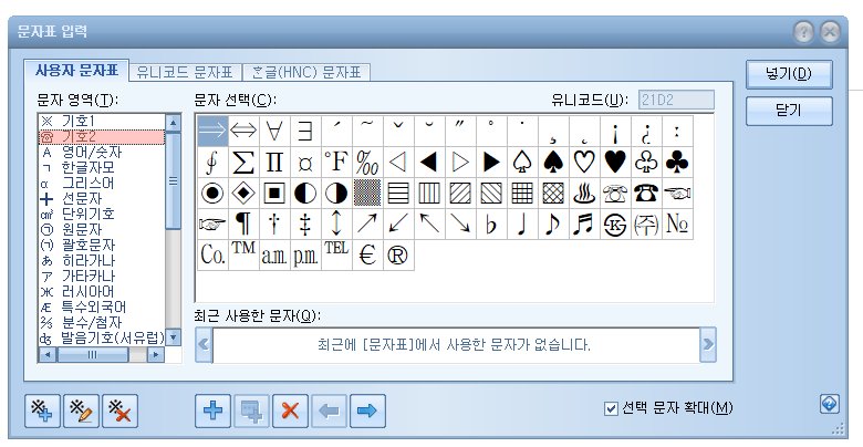한글로 문서를 작성하다보면 특수문자를 사용해야 하는 상황들이 자주 발생한다. 부등호, 특수문자, 원문자, 괄호 문자, 단위 기호, 분수, 첨자 등 키보드에 표시가 되어있지 않기 때문에 상당히 곤란하다고 할 수 있다.