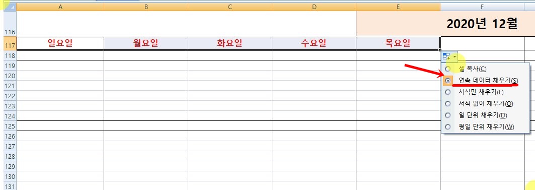 우측으로 드레그를 하고 나면 조그만 네모 박스를 확인할 수 있다. 해당 박스를 눌러보면 셀 복사, 연속 데이터 채우기, 서식만 채우기 등의 다양한 메뉴가 나온다.