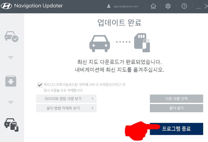 이로써 싼타페 내비게이션 업데이트가 종료됐다. 종료 버튼을 누르고 내비게이션이 정상적으로 업데이트 되었는지 확인을 해보자.