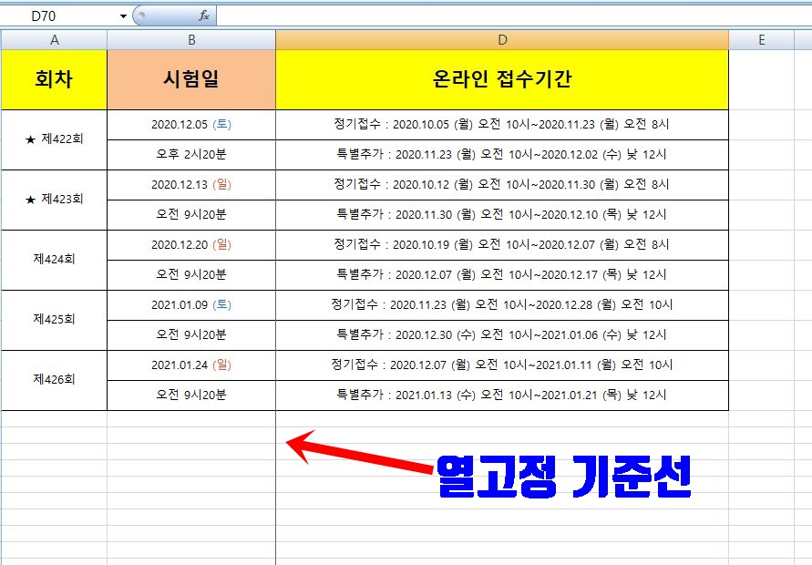 열 고정도 앞서 진행한 행 고정과 지정 방법은 동일하다. 시험일 항목을 고정시키고 싶다면 그다음 열인 온라인 접수기간을 선택한 후 틀 고정 버튼을 누르면 된다.