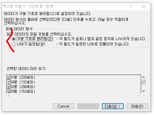 구분 기호 중에서도 탭, 세미콜론, 쉼표, 공백, 기타 등의 방법으로 나눌 수가 있다. 단 여기서 한 가지 주의할 점은 자신이 나누고자 하는 열에 있는 텍스트의 값은 다르더라도 형식 등은 같아야 한다는 사실이다.