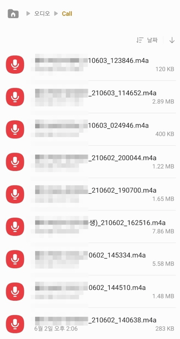 이 폴더가 바로 전화통화 시 자동적으로 녹음된 파일이 있는 위치라고 할 수 있다. 중요한 녹음파일의 경우 여기서 다운로드하여서 저장해두면 된다.