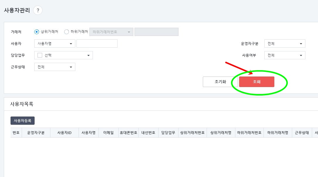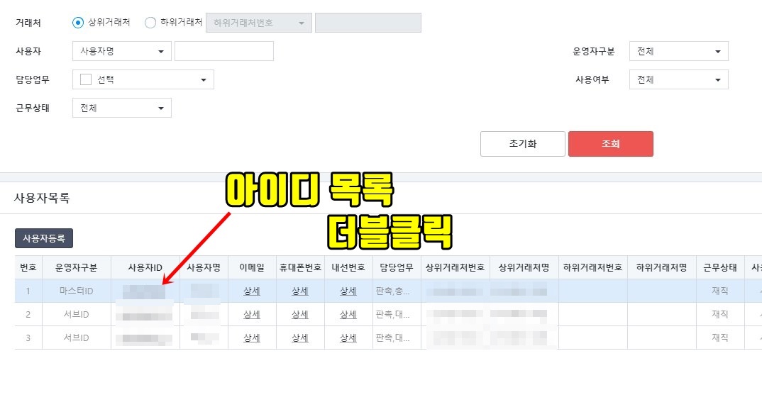 그럼 어떻게 비번 변경을 하는지 궁금하시다구요? 바로 조회를 통해서 현재 사용자를 확인하는 방법이 있습니다. 아래 사진에서 보는 것과 같이 조회 버튼을 선택하면 해당 계정에 등록되어 있는 아이디를 살펴볼 수가 있는 것입니다.