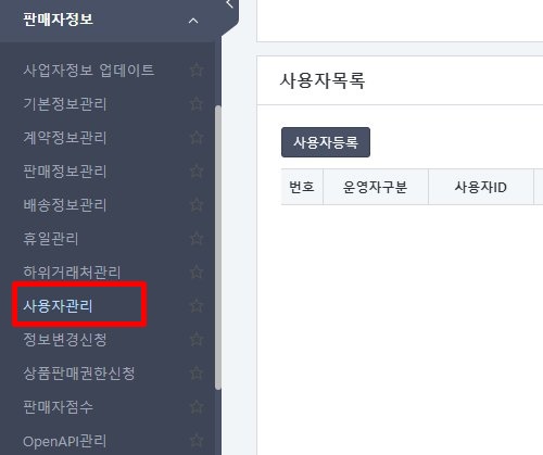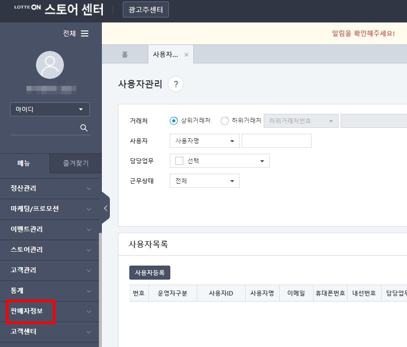 가장 먼저 롯 데온 판매자 계정에 접속 후 좌측에 있는 판매자 정보를 선택하시면 됩니다. 판매자 정보를 살펴보면 하단에 사용자 관리 부분을 확인할 수 있는데요.
