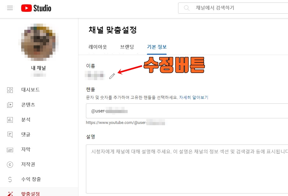 유튜브 채널이름, 주소, 핸들, 설면문구 변경 하는방법