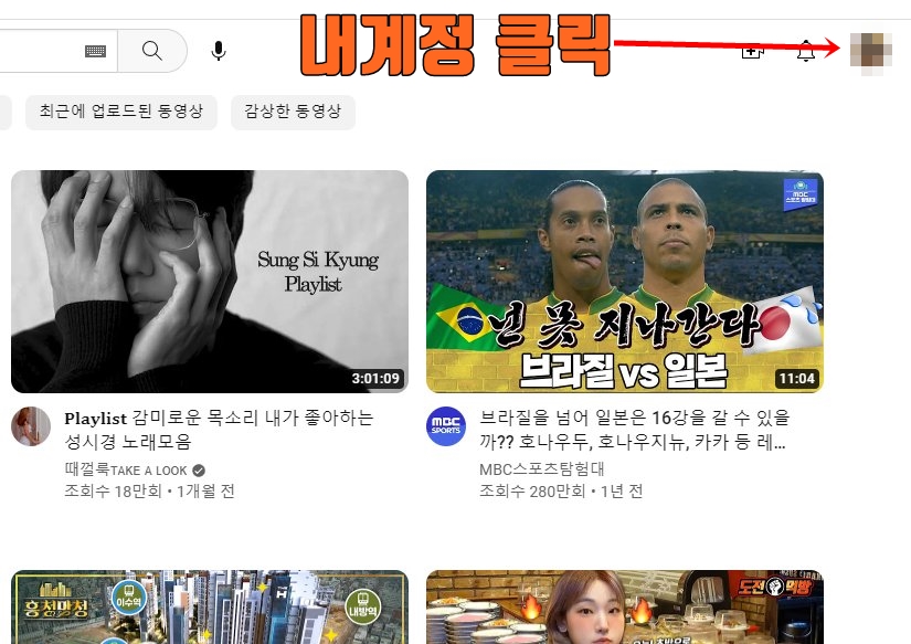 먼저 자신의 구글계정으로 로그인을 한다. 유튜브 홈페이지에 접속 우측 상단에 있는 자신의 계정 이미지를 선택.