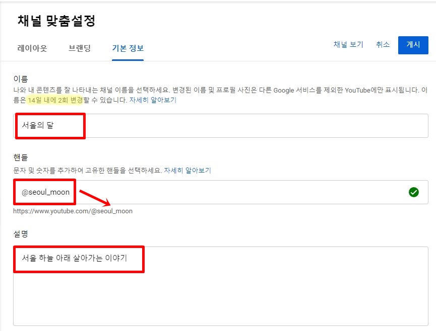 채널이름을 서울의 달로 변경해 보았다. 그리고 채널주소라 할 수 있는 핸들을 seoul_moon으로 수정했다. 그리고 설명 부분은 내가 만든 채널을 소개하는 문구를 넣어서 적었다.