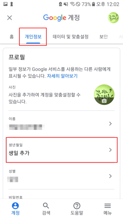 우측 상단에 있는 자신의 아이디를 누르면 구글 계정관리 화면이 나온다. 그다음 개인정보 카테고리로 들어가면 생년월일을 업데이트할 수가 있다.