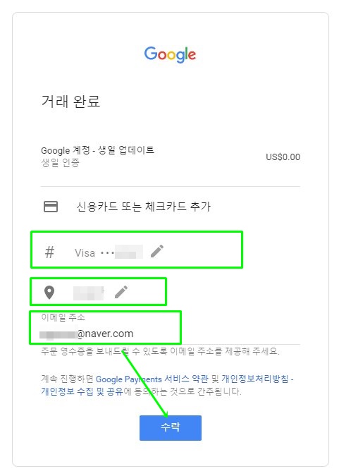 보유하고 있는 신용카드 정보를 입력하고 수락을 누르면 끝. 혹시라도 해외에서 사용되는 게 아닐까 의심할 수도 있지만 절대 그런 걱정을 할 필요가 없다. 구글만큼 안전한 기업도 없으니까. 또한 카드 정보를 입력해도 결제는 되지 않기 때문에 절대 걱정하지 않아도 된다.